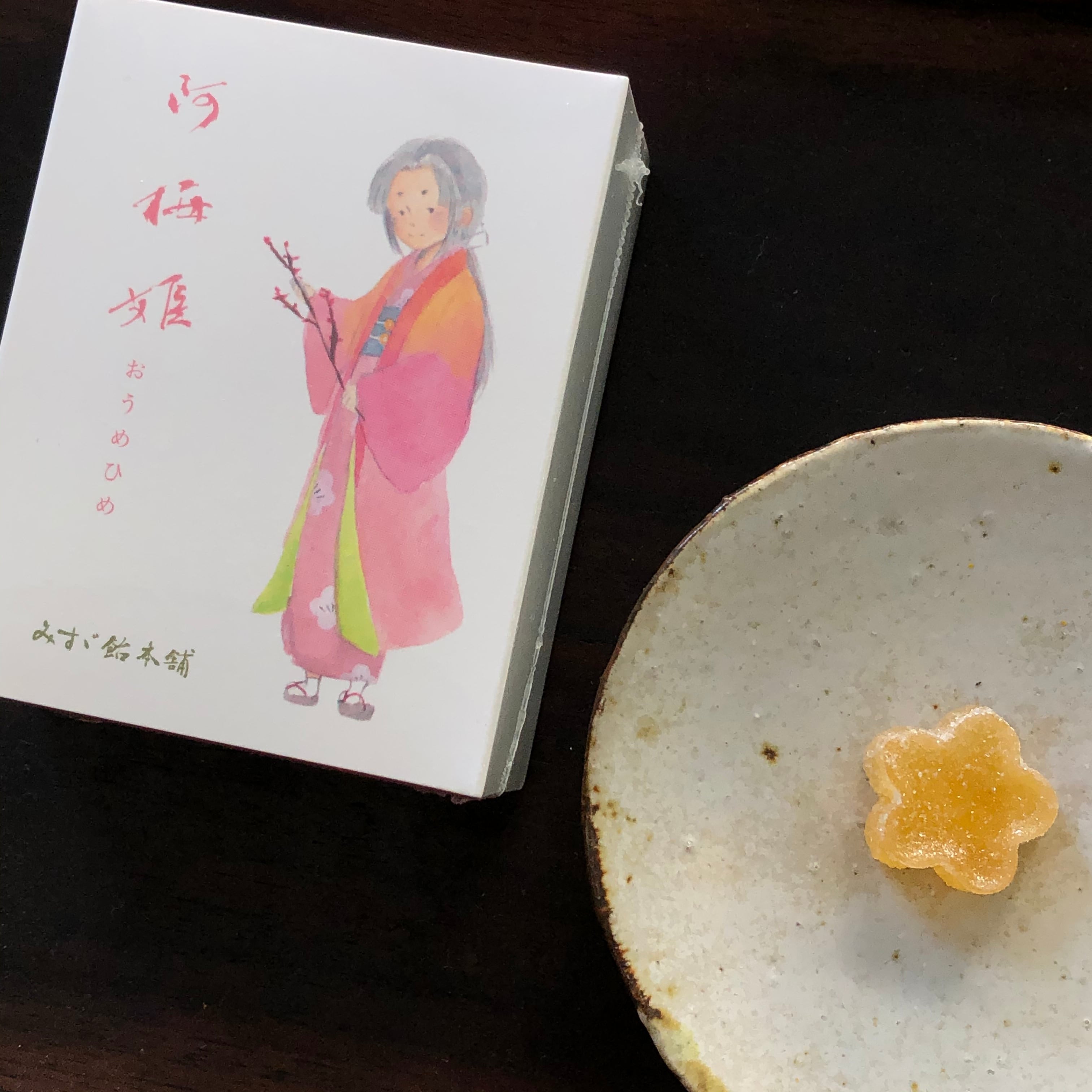 上田の英雄真田信繁(幸村)の三女「阿梅」にちなんだお菓子。梅の花の形にくり抜いて、高級なお砂糖でまぶして仕上げた一口大の梅のゼリーです。