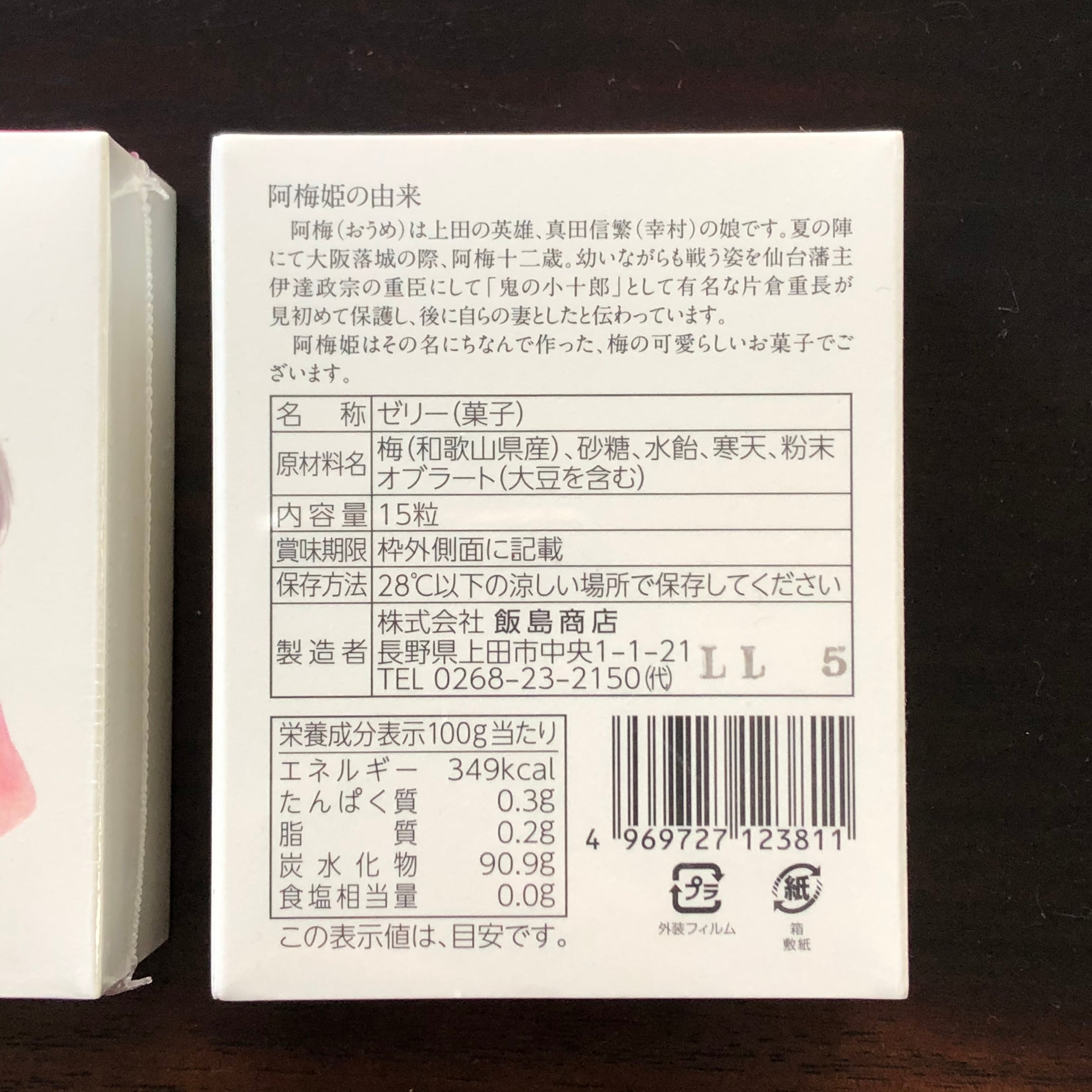 梅(和歌山県産)、砂糖、水飴、寒天、粉末オブラート(原材料の一部に大豆を含む)